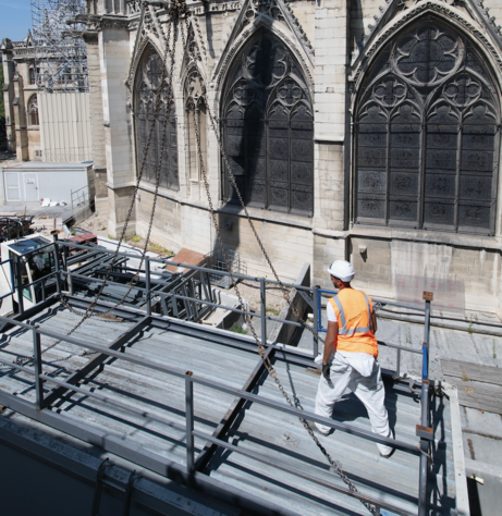 L’incendie de Notre-Dame de Paris se déclenche le lundi 15 avril 2019. Les dégâts sont immenses. Il faut très vite sécuriser toute la structure. Géraldine Raoul reçoit un appel téléphonique le mardi 23 avril au matin d’Europe Échafaudage, l’entreprise sélectionnée par Philippe Villeneuve, architecte en charge des Monuments de France pour le chantier. Une base vie doit être installée au pied du cloître pour accueillir les compagnons et démarrer les travaux. Tout doit être installé sur site, le 6 mai ! A priori, c’est impossible. A priori… Géraldine raconte : « J’adore les défis, mais là, j’avoue avoir été secouée ! Je suis partie immédiatement en quête d’une solution. Heureusement, nous disposions dans notre agence à Servon d’une partie des modules nécessaires. Avec l’appui de Sarah Moujid, Responsable de Production, et de Sophie Vevilly, Responsable Ordonnancement, mais aussi grâce à la mobilisation de toute l’agence Paris-Est, nous avons tenu les délais. Le 6 mai, nous avons acheminé 18 modules Origin tout équipés ainsi que 2 colonnes d’escaliers cage. L’installation s’est faite en une journée. En y repensant, c’est une véritable prouesse…»